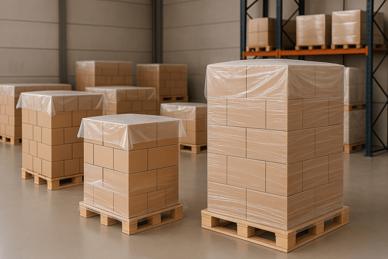 Solución para cubrir y proteger pallets durante almacenamiento o transporte, con opción termoencogible que se adapta a la carga asegurando protección completa.